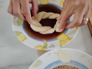 When the dough feels ready, I shape it into long ropes, twist them into rings, and dip each ring in the molasses mixture. Then I roll the rings in sesame seeds until every side shines with a golden layer. At this point, the simit already looks irresistible.
