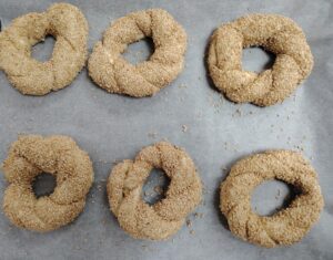 - Place the coated simits on a baking sheet lined with parchment paper.
