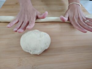 - Shape the simit: Punch down the dough and divide it into 10 equal pieces.