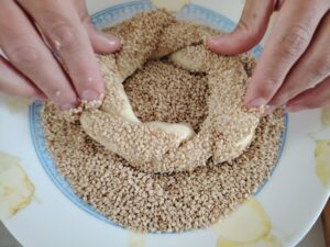 - Then roll it in the sesame seeds until fully covered.